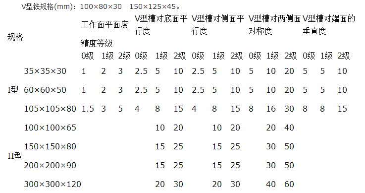 V型鐵按國(guó)家GB4972-85標(biāo)準(zhǔn)制造,一般都成對(duì)供應(yīng),是一個(gè)四棱體,四個(gè)工作面上或四個(gè)尺寸不同的90度的槽。主要適用于軸類零件的檢驗(yàn)和劃線。